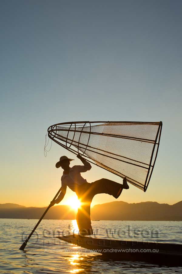 Myanmar (Burma) 02/02/2014 by andrewwatson Inle Lake fisherman with traditional net and leg rowing technique at sunset Share this:ShareGoogleFacebookLinkedInEmailTwitterPrint