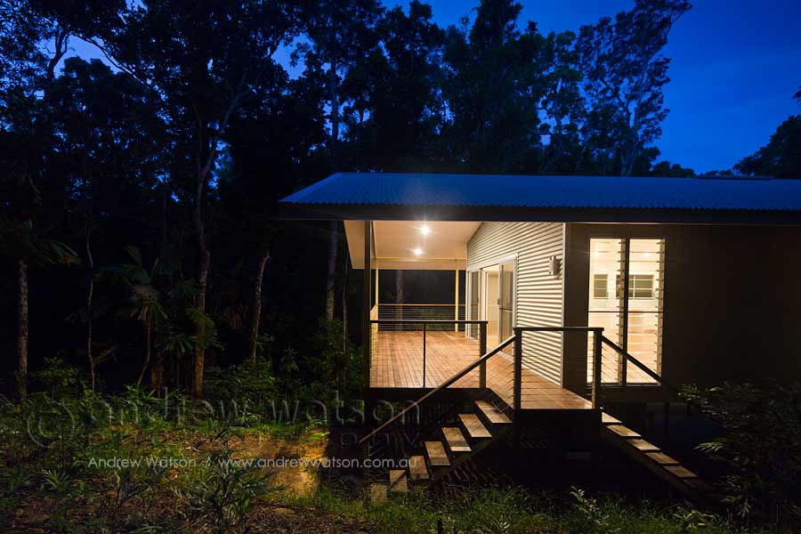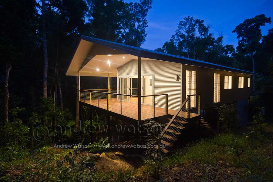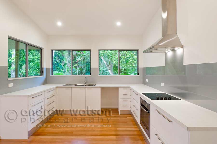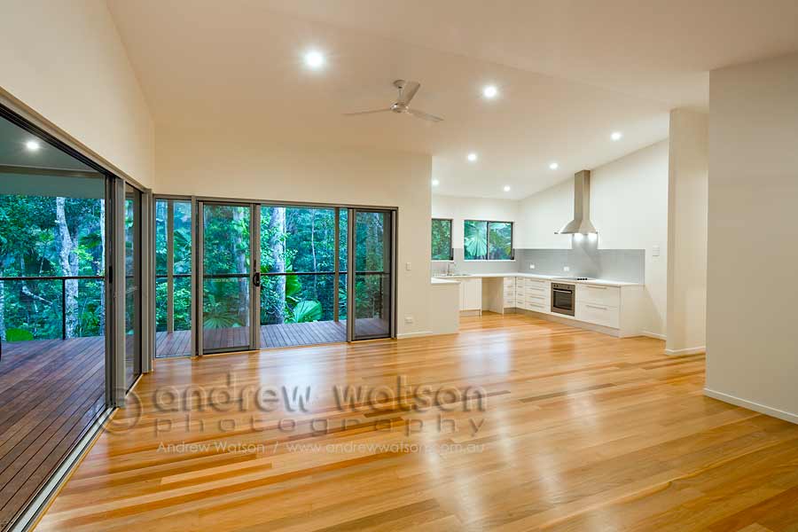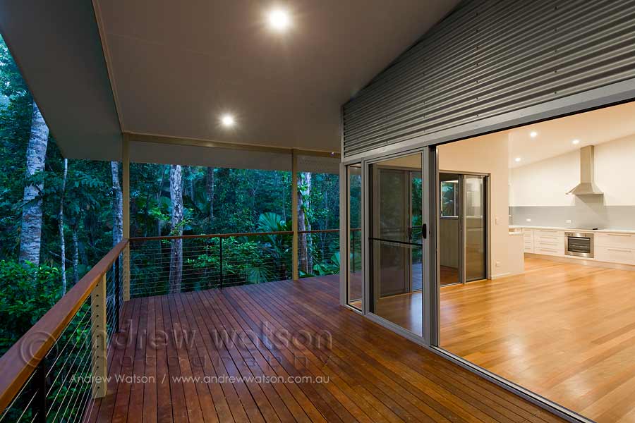 I was recently down in Innisfail for the architectural photography of a new house for MiHaven, designers and builders of steel framed houses that can be built in relatively quick timeframes (8-12 weeks). This house, located in Jubilee Heights on the outskirts of Innisfail, has a fairly straightforward layout internally, with a rear deck that opens out onto a magical view of the tropical rainforest, which hems it in on all sides.