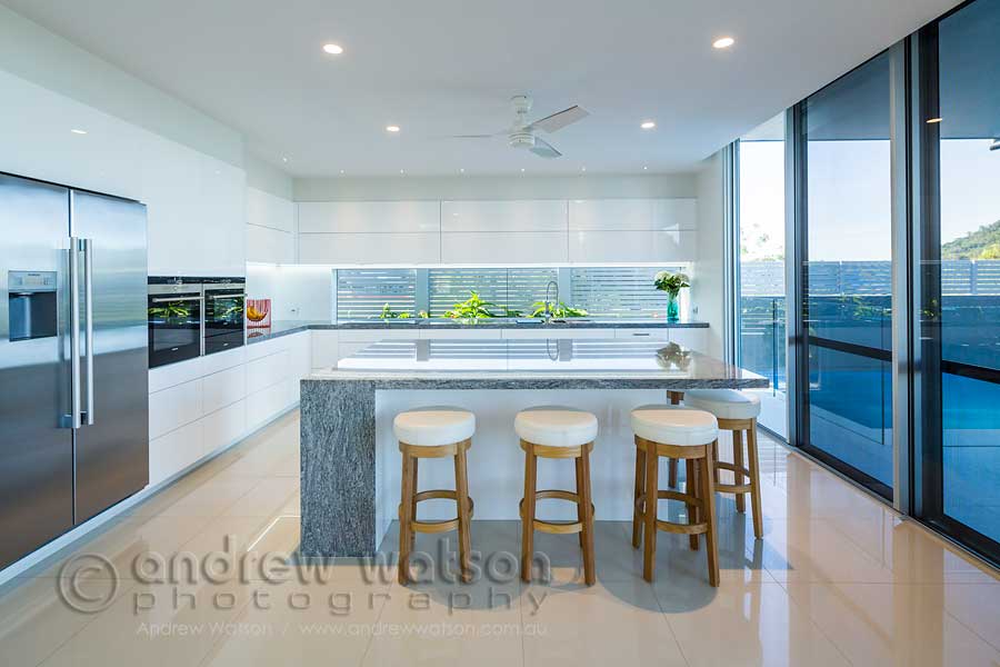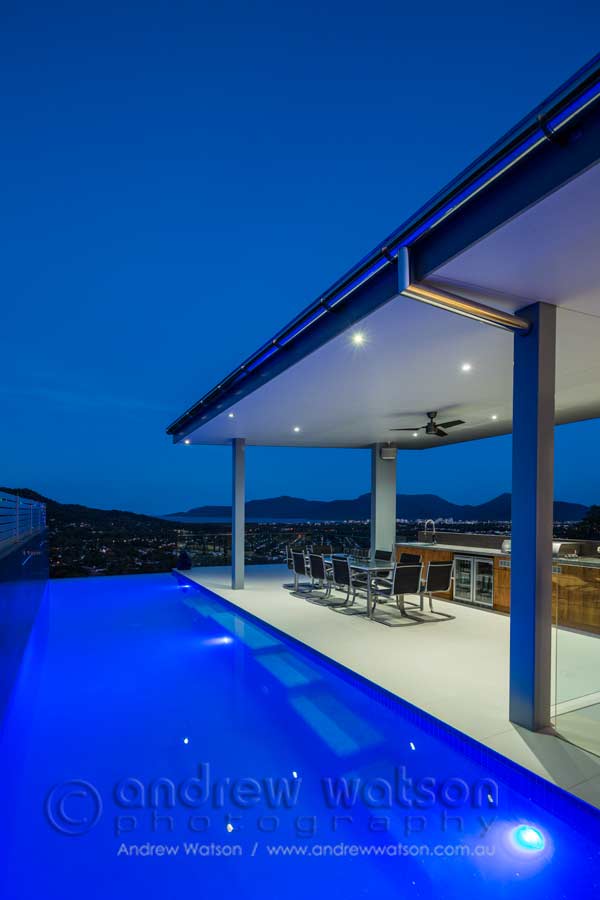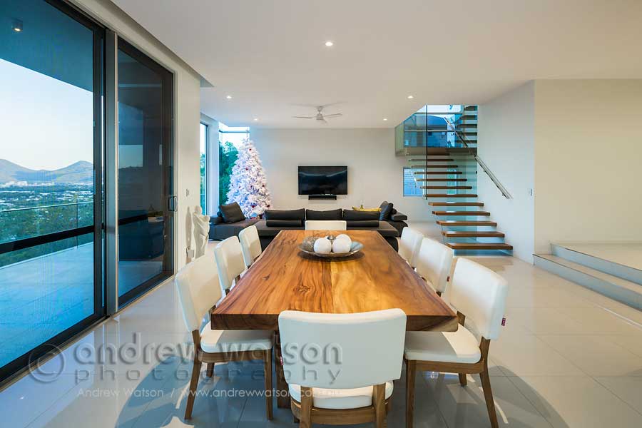 I recently had the privilege of photographing a beautiful residential home designed by Julianne McAlloon Architects. Sitting atop a hillside overlooking Cairns, the striking facade features cascading, irregular concrete steps through a landscaped garden. At night these steps illuminate, creating a sense of a staircase floating on light. An enlarged foyer walkway leads through to an open plan living, dining and kitchen area which opens out to expansive outdoor areas with city views. Other great touches include an upper living room which flows into the master bedroom & ensuite, and a floating timber staircase linking the two levels.