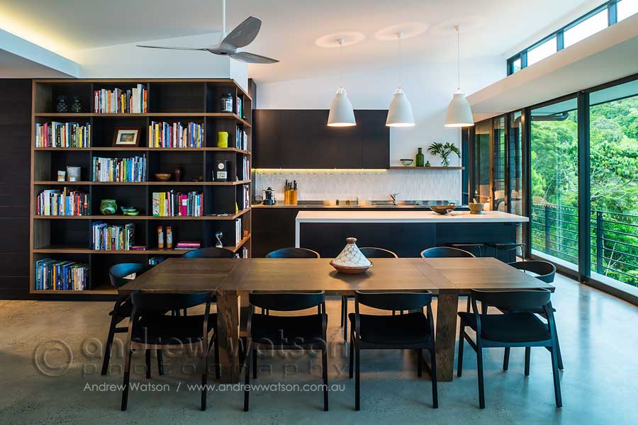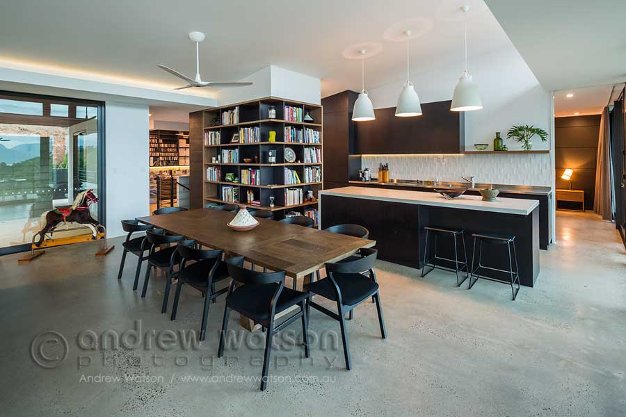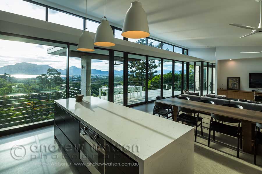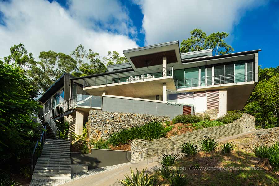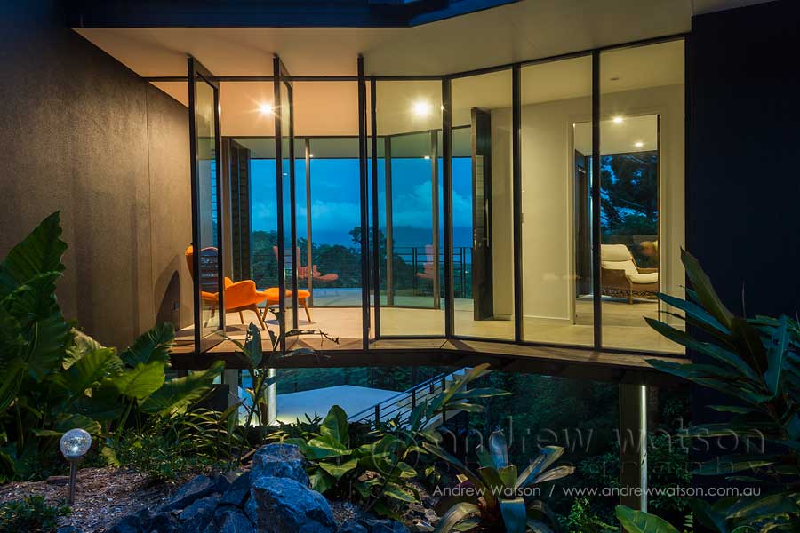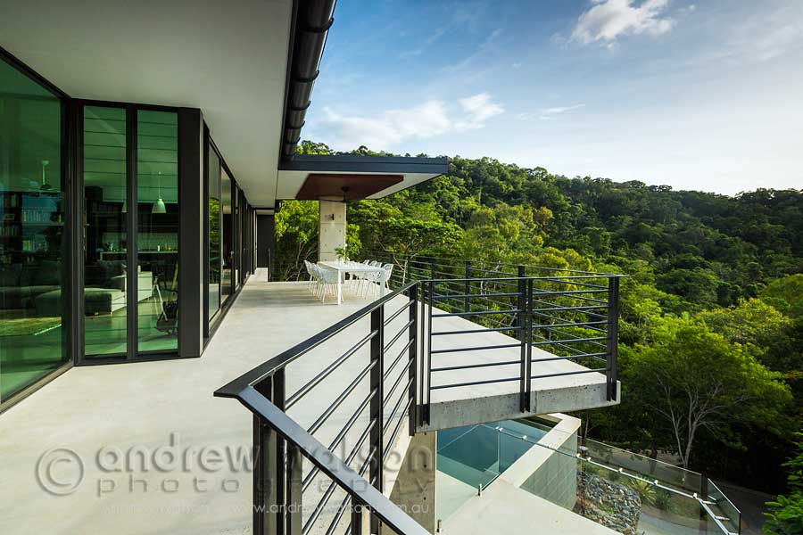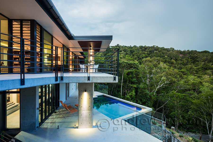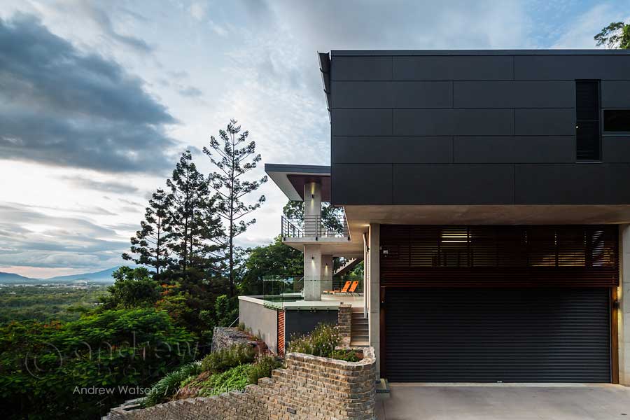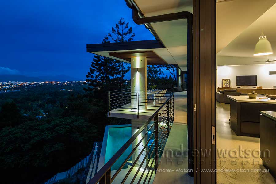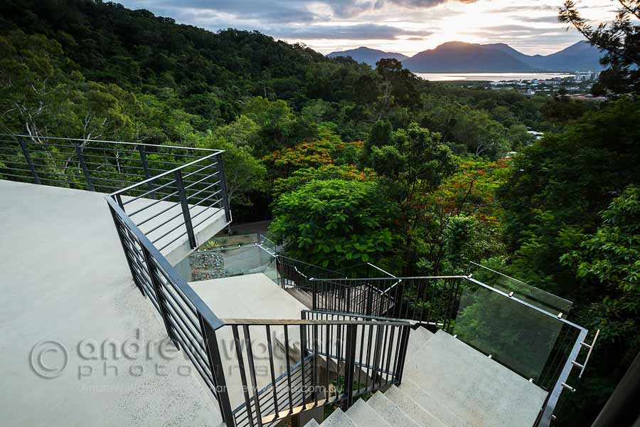 Total Project Group Architects commissioned me with the architectural photography of one their recent projects – an amazing residential home built on the steep hillsides of Cairns. Visually stunning, the house is built over three levels and is understated in its use of materials and clean lines. Bedrooms are connected to the main living and dining areas via a glass-lined walkway. A multi-angled stairway leads visitors up to the front entrance. The outdoor dining area overlooks a pool deck below and the house has great views over the city, whilst giving the feeling of being a world-away, immersed in greenery. Faced with a shoot during changeable mid-summer weather we did most of the photography late afternoon, leading into twilight, with some additional photography early morning to capture the sun lighting up the formidable facade.