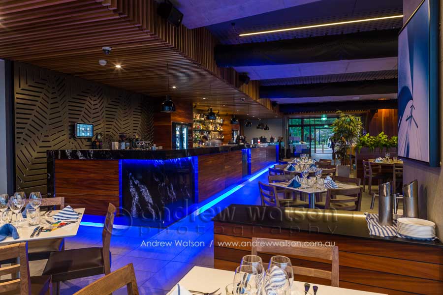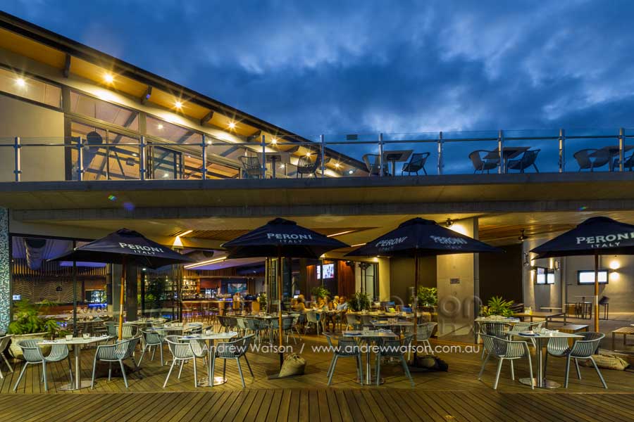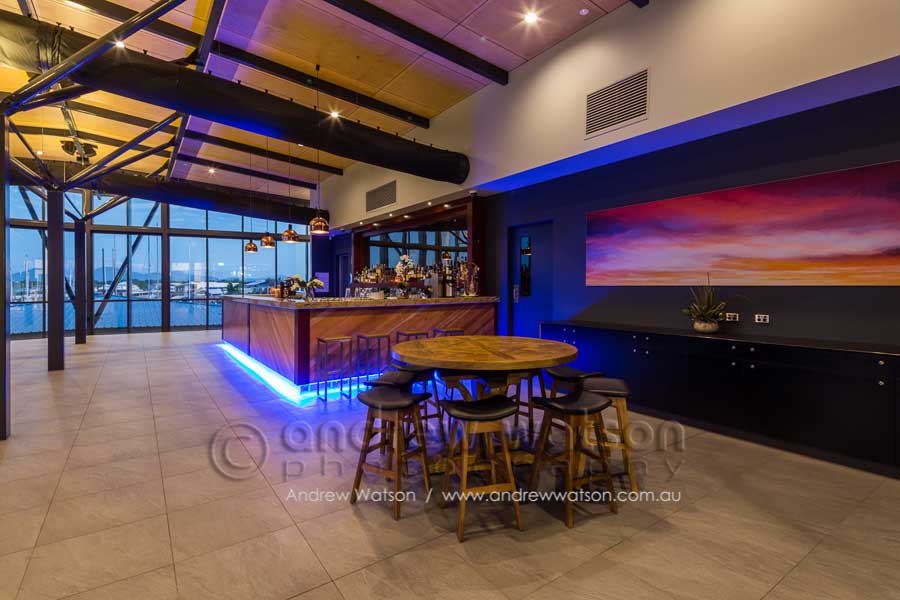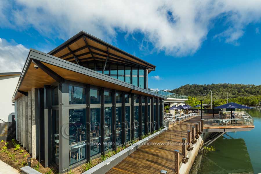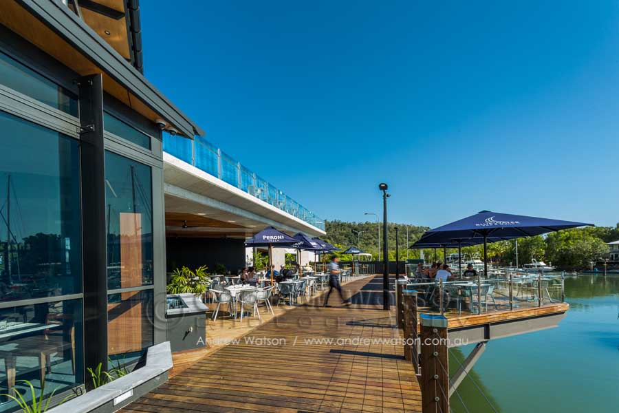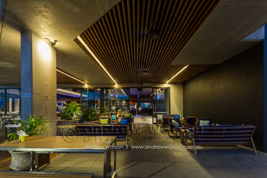 The Bluewater Bar & Grill is at the centre of a new marina-based residential precinct in the north Cairns suburb of Trinity Park. The building incorporates a restaurant with a spacious deck overlooking the marina, as well as a bottle shop, deli and admin area. Providing the photography for the architects, Coburn Architecture, we looked to highlight the strong angular forms of the building, along with its clever use of natural materials to create space, natural lighting and to showcase its waterfront views.