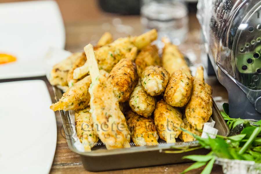 - Mike and Tarq’s entree of sugar cane prawns with green paw paw salad