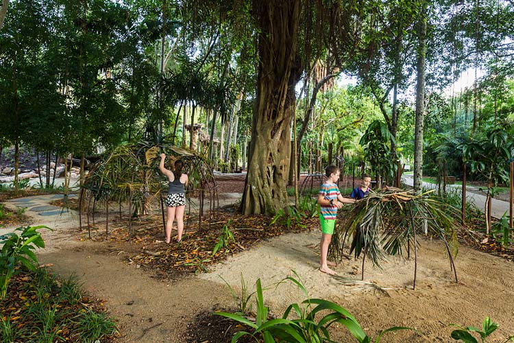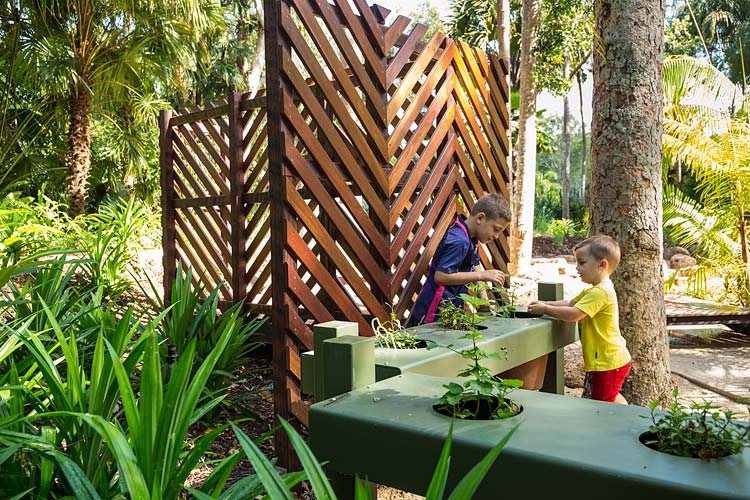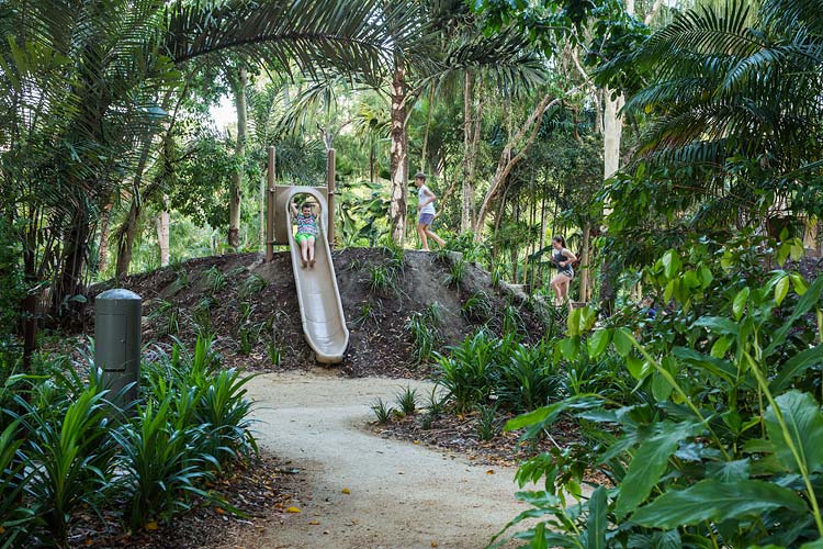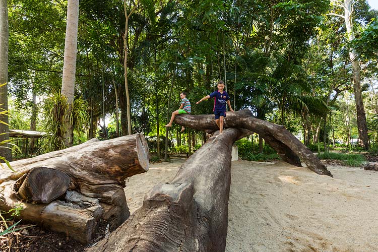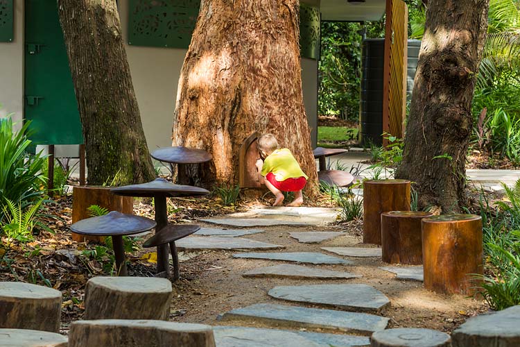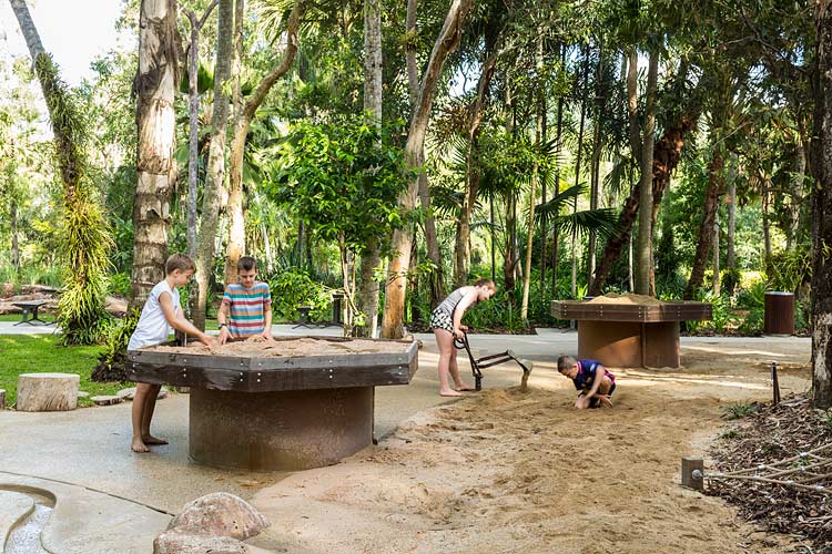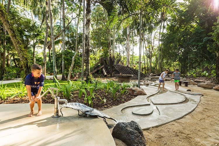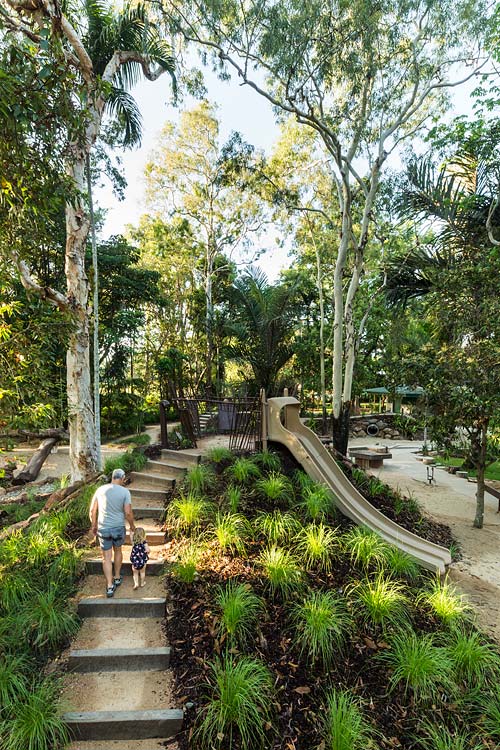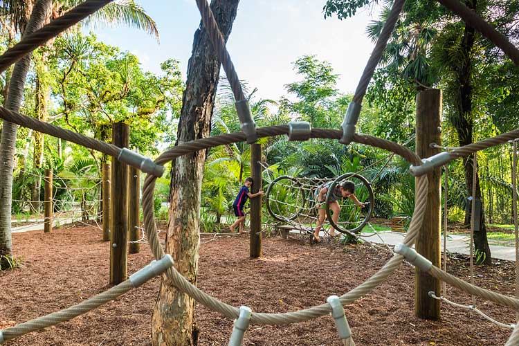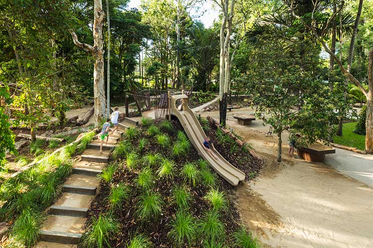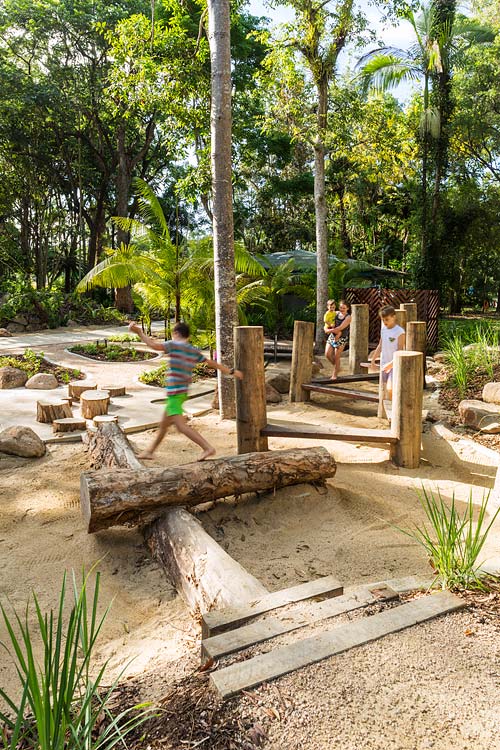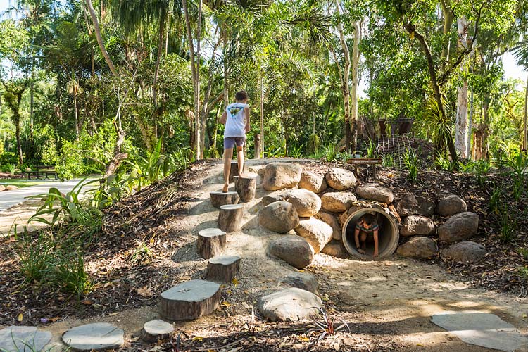 Centenary Lakes Nature Play is a throwback to how kids used to play – exploring unhindered, challenging themselves and developing their sense of wonder through elements of the natural environment. This ‘first of a kind’ project for the Cairns Regional Council wonderfully integrates creative play elements into tropical garden surrounds. Kids can play and interact freely, inspired by elements such as rope climbs, balancing logs, stepping stones, cubby house builds, water pumps, dinosaur bone digs, fairy gardens, tunnel crawls and giants snake paths.
