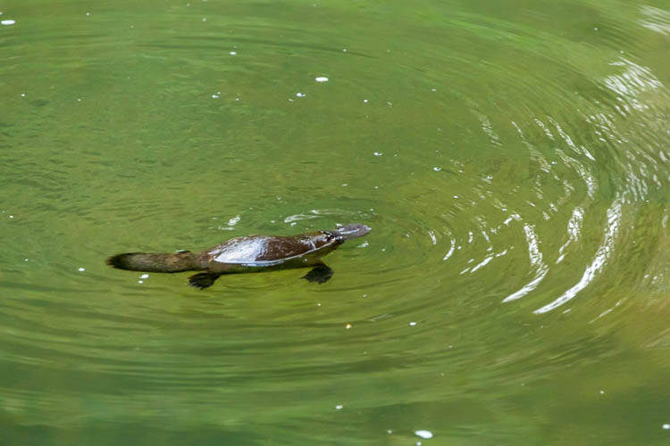 Soon enough a platypus appeared – small, brown and unmistakable with it’s duck-bill and beaver-like tail. It would float at the surface for an instant before diving and rummaging through the creek floor, disappearing in a plume of silt before popping up again, somewhere nearby. That morning we were lucky to see several platypuses along the river. Each time we’d sit transfixed by their curious behaviour, feeling very privileged to have witnessed them in the wild.