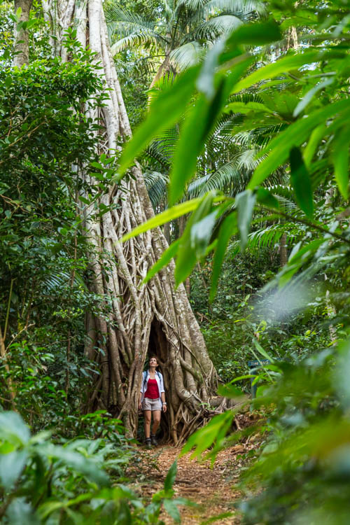 The afternoon was spent exploring some of the National Park walking trails. The Rainforest Discovery circuit (800m – 30 mins return) crossed trickling creeks and provided easy rainforest immersion. Closer to the township of Eungella, the Palm Grove to Cedar Grove track (2.8km 1.5hr return) was a highlight, with the opportunity to stand inside the remarkable strangler fig tree arch.