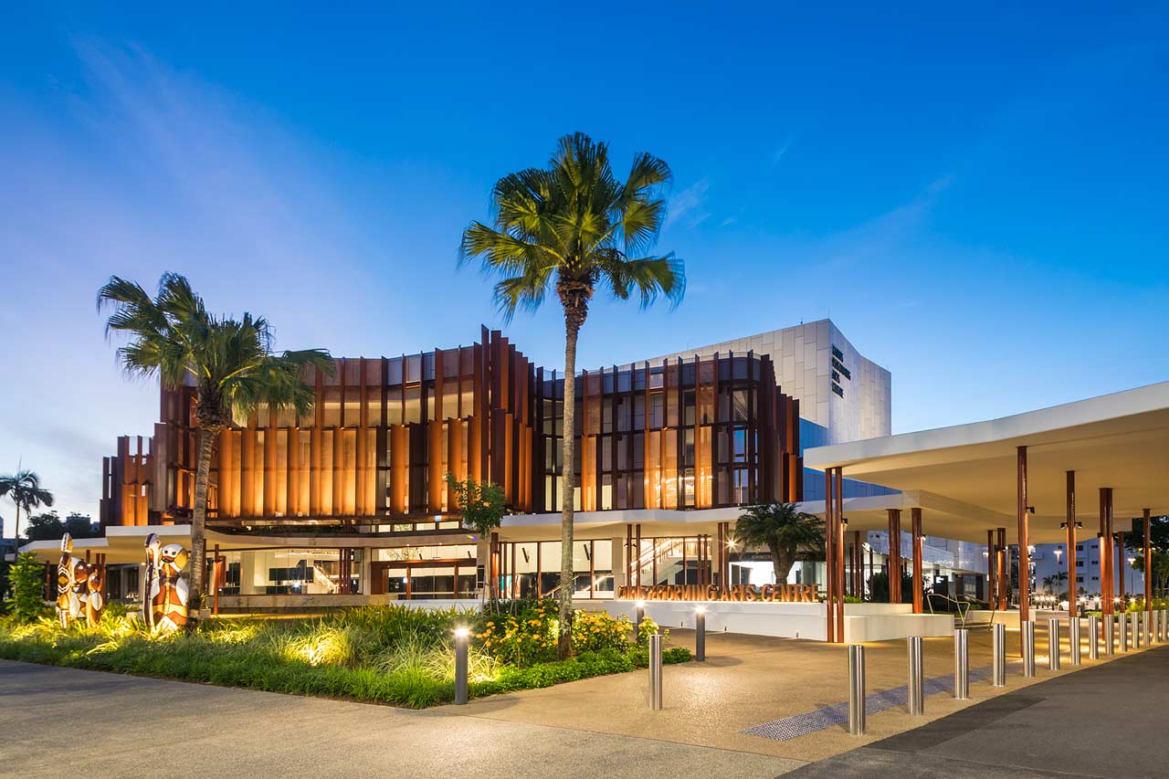 The new Cairns Performing Arts Centre illuminated at twilight
