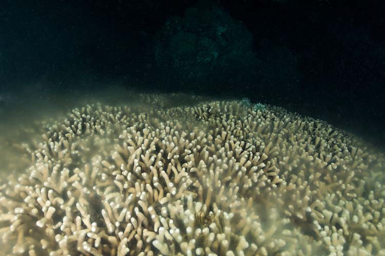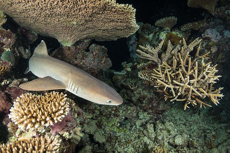 A white-tip reef shark hunting amongst the corals at night