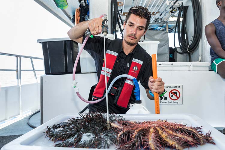 COTS worker demonstrating the chemical injection process to kill crown of thorns starfish