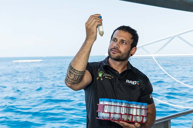 A COTS researcher with water samples used to determine the prevalence of crown of thorns starfish