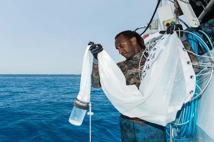 A COTS researcher collecting water samples used to determine the prevalence of crown of thorns starfish