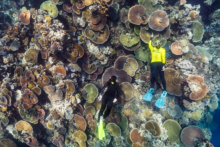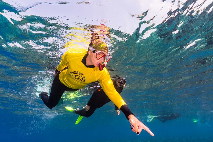 A Master Reef Guide pointing out coral species to a snorkeller at Moore Reef