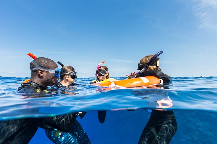 Master reef guide talking to snorkellers