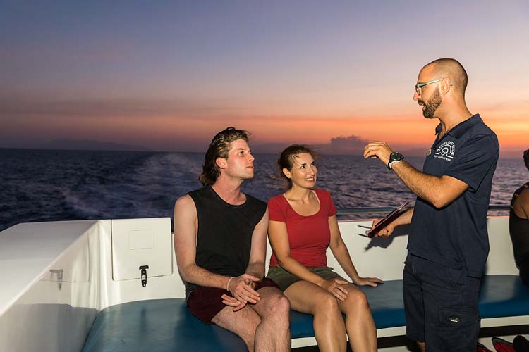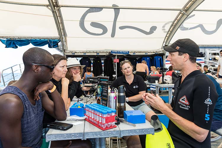 A Master Reef Guide talking to passengers about the spawning dive