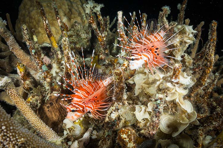 A pair of lionfish amongst the corals at night