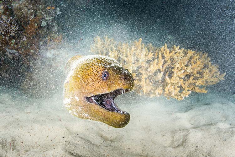 A moral eel hunting amongst the corals at night