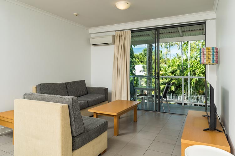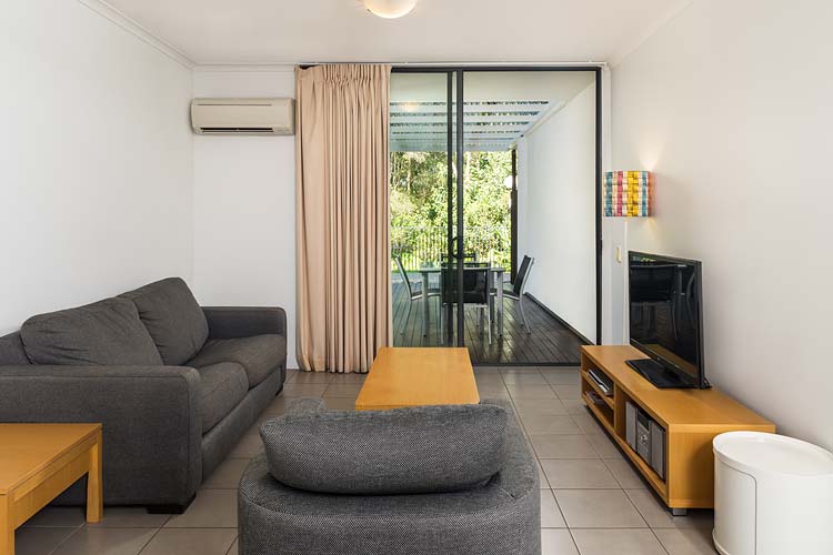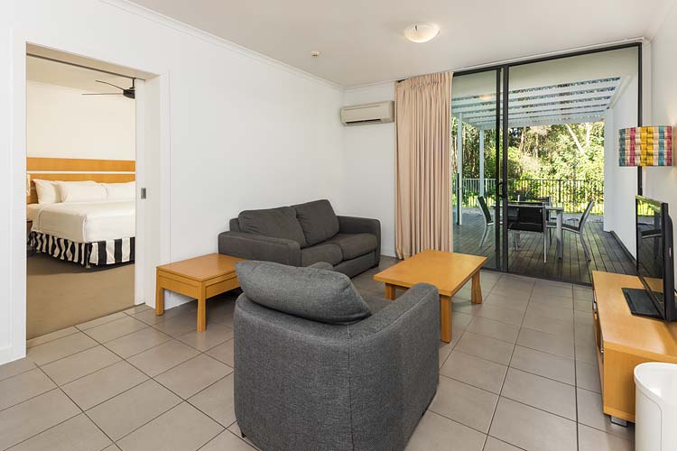 Lounge room and outside deck in one-bed spa room