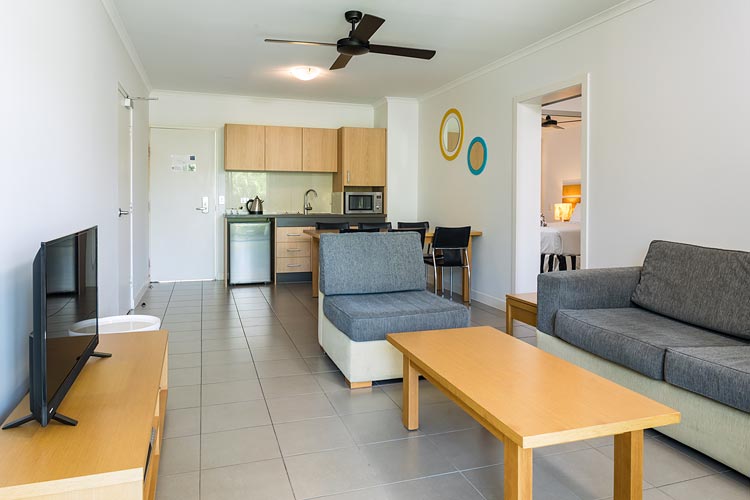 Lounge and kitchen areas of a one-bed spa room