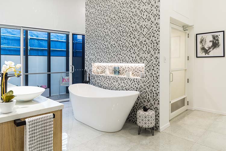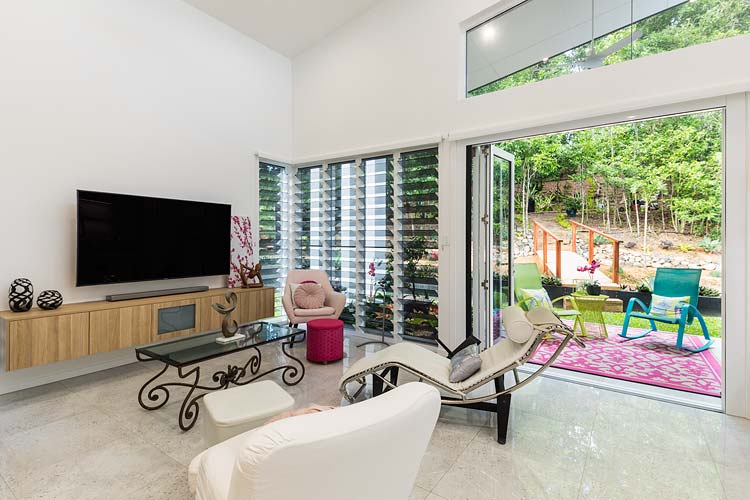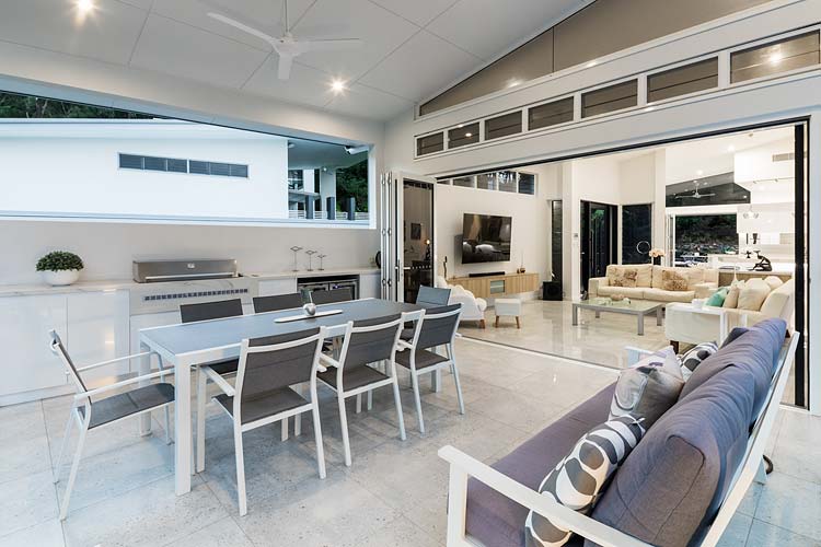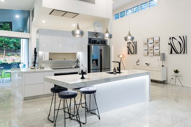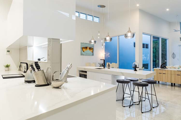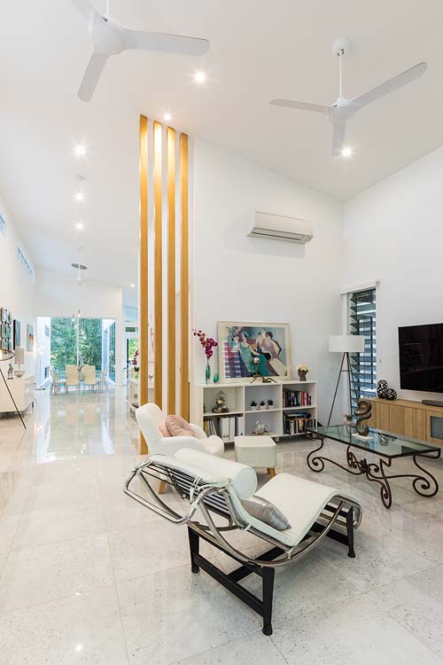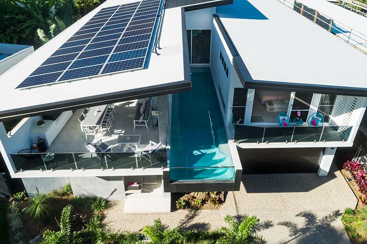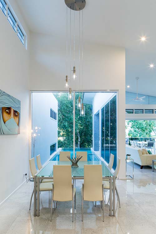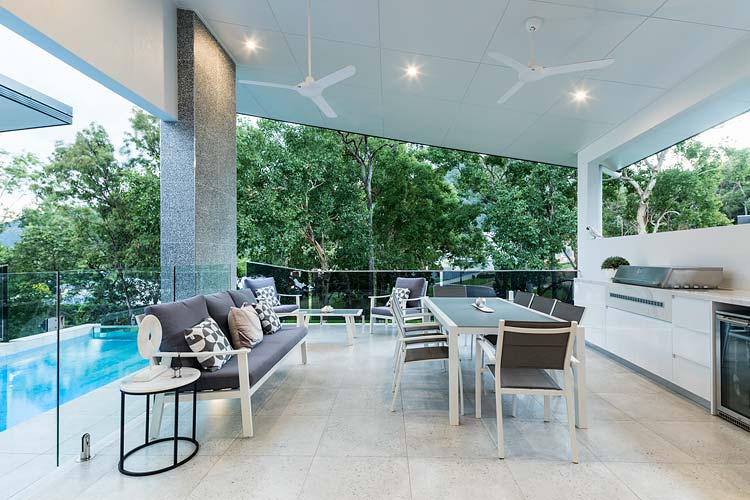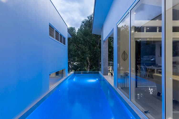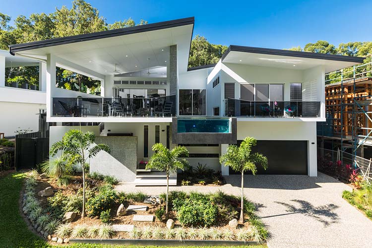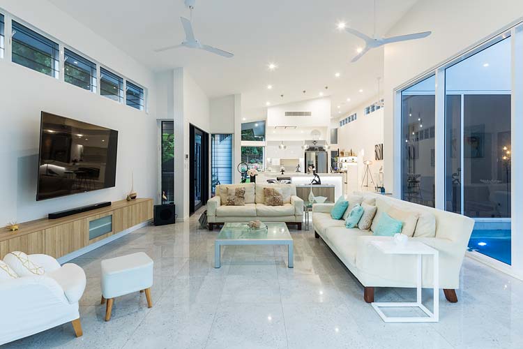 With a view to entry in the upcoming Housing Industry Awards, we recently photographed an architectural project for Eastbuild in Ocean’s Edge estate, at Palm Cove. The house features a dramatic facade with high angled roof and a cantilevered lap pool that seems to float between levels. The left side of the property incorporates a spacious open plan area, leading from the outdoor entertaining area through to the living, kitchen and dining areas. From there it flows through to the lounge area and rear patio. The right side of the property features the bedrooms and a stunning bathroom with mosaic feature wall. Here are some of the pics from the shoot.