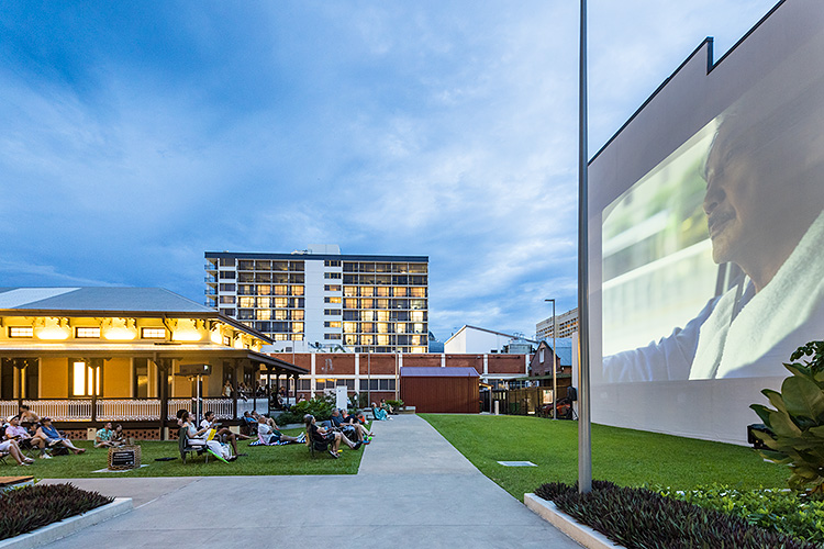 Visitors watching a twilight film on the lawn at the rear of the Mulgrave Gallery